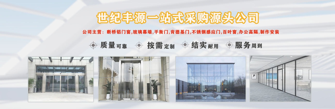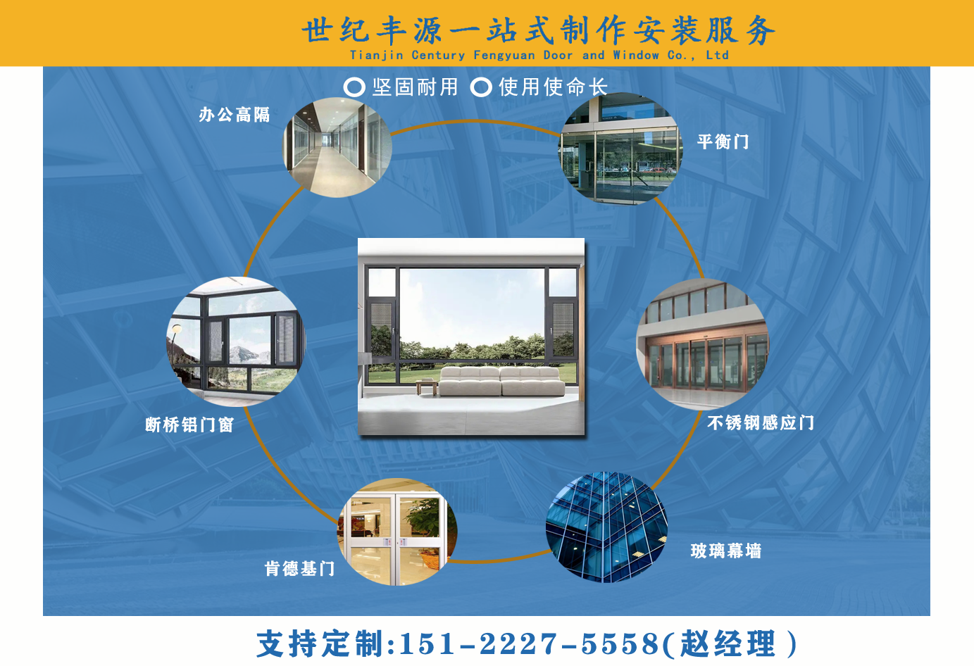 天津世紀豐源門窗有限公司從事斷橋鋁門窗,玻璃幕墻,平衡門,肯德基門,不銹鋼感應門,百葉窗,辦公高隔,制作安裝一站式訂制生產(chǎn)及配套服務等。 公司自成立以來,始終堅持以人才為本、誠信立業(yè)的經(jīng)營原則,薈萃業(yè)界精英,成熟的技術、管理方法及企業(yè)經(jīng)驗與國內(nèi)企業(yè)的具體實際相結(jié)合,為企業(yè)供給各個方面的解決方案,使企業(yè)在激烈的市場競爭中始終堅持競爭力,實現(xiàn)企業(yè)快速、穩(wěn)定地發(fā)展。 質(zhì)量好、服務好、才能信譽好,公司已在諸多領域取得輝煌成績,愿意成為您可信賴的長期合作伙伴。 讓我們攜手同行,共同實現(xiàn)“讓普通老百姓都用得上高端門窗”...